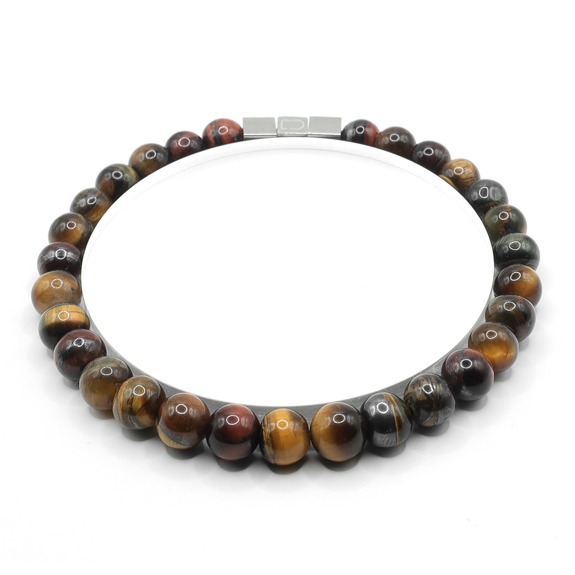 Armband met 6 mm ronde kralenmix van gele, rode en grijsblauwe Tijgeroog kralen en 5 mm cube kralen van zilverkleurig Stainless steel incl. een glanzende sluitkraal met CJ logo.