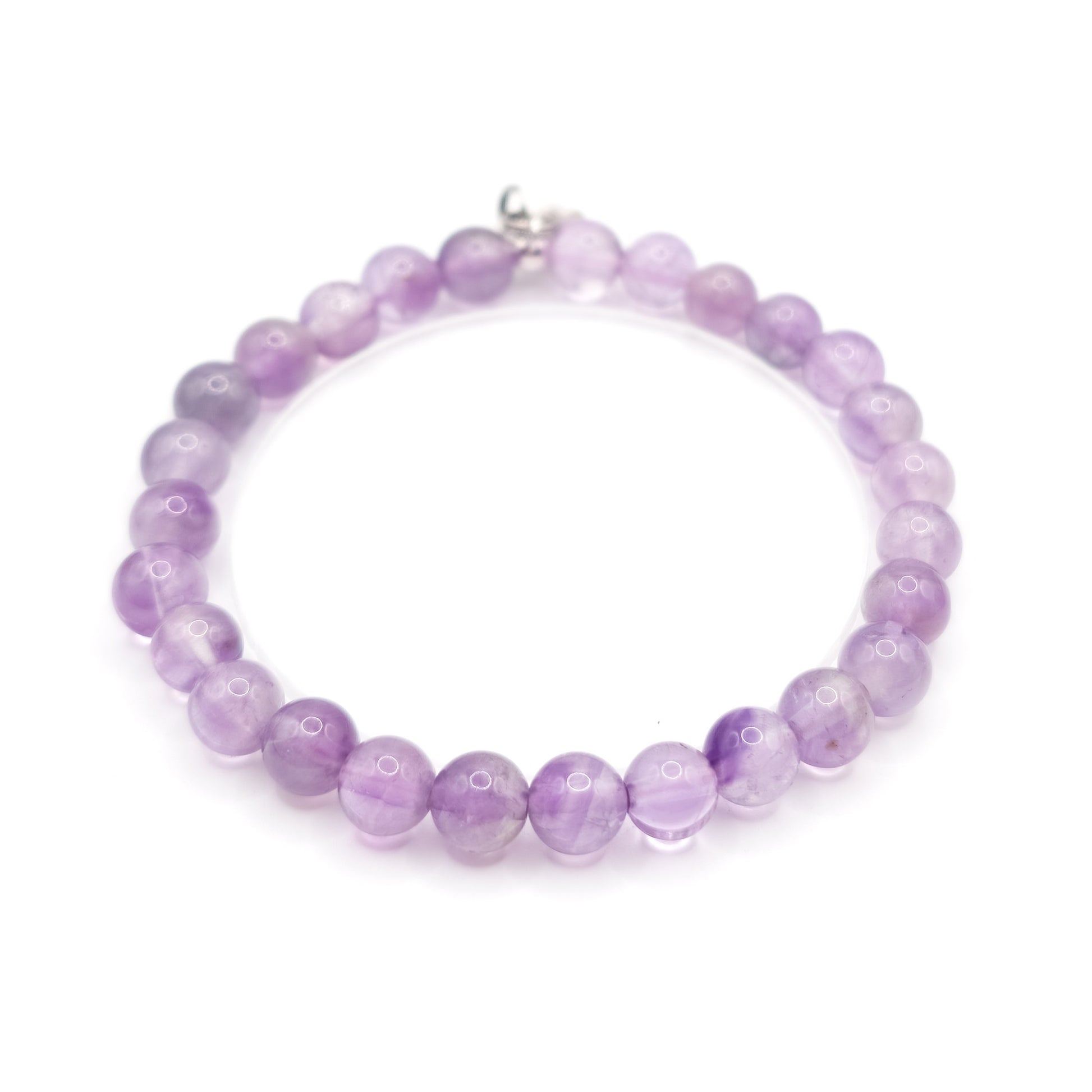 Armband met 6 mm ronde lavendel Amethist kralen met een 925 Sterling Zilveren sluitkraal en CJ logo label van Stainless Steel.