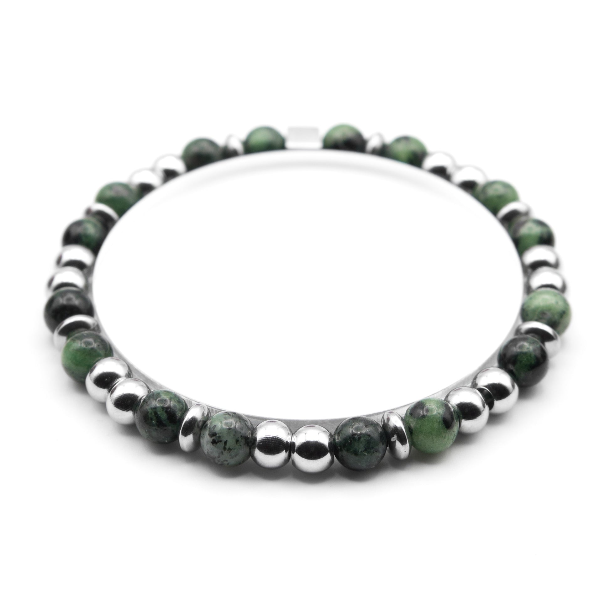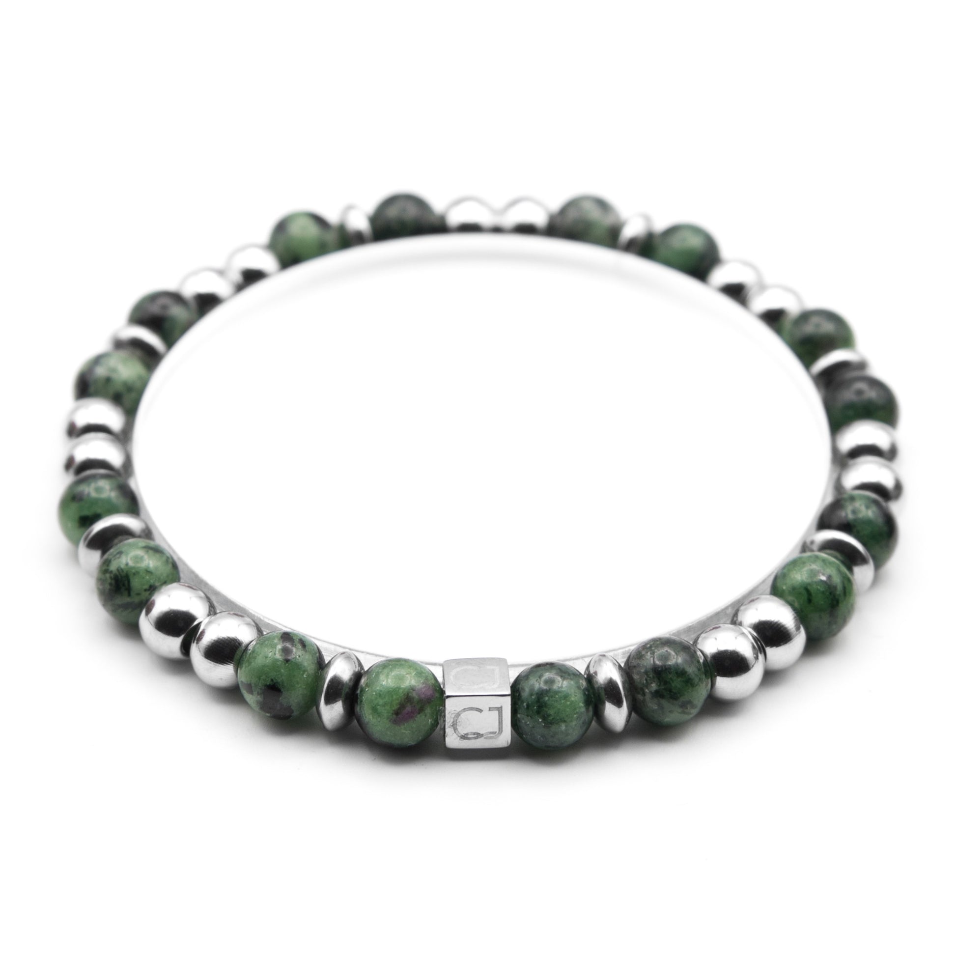 Armband met 6 mm ronde groene Zoisiet en Stainless Steel kralen met een 5 mm glanzende sluitkraal met CJ logo van zilverkleurig Stainless steel.
